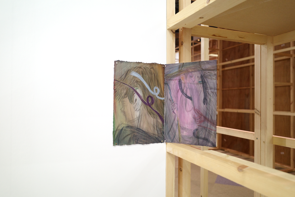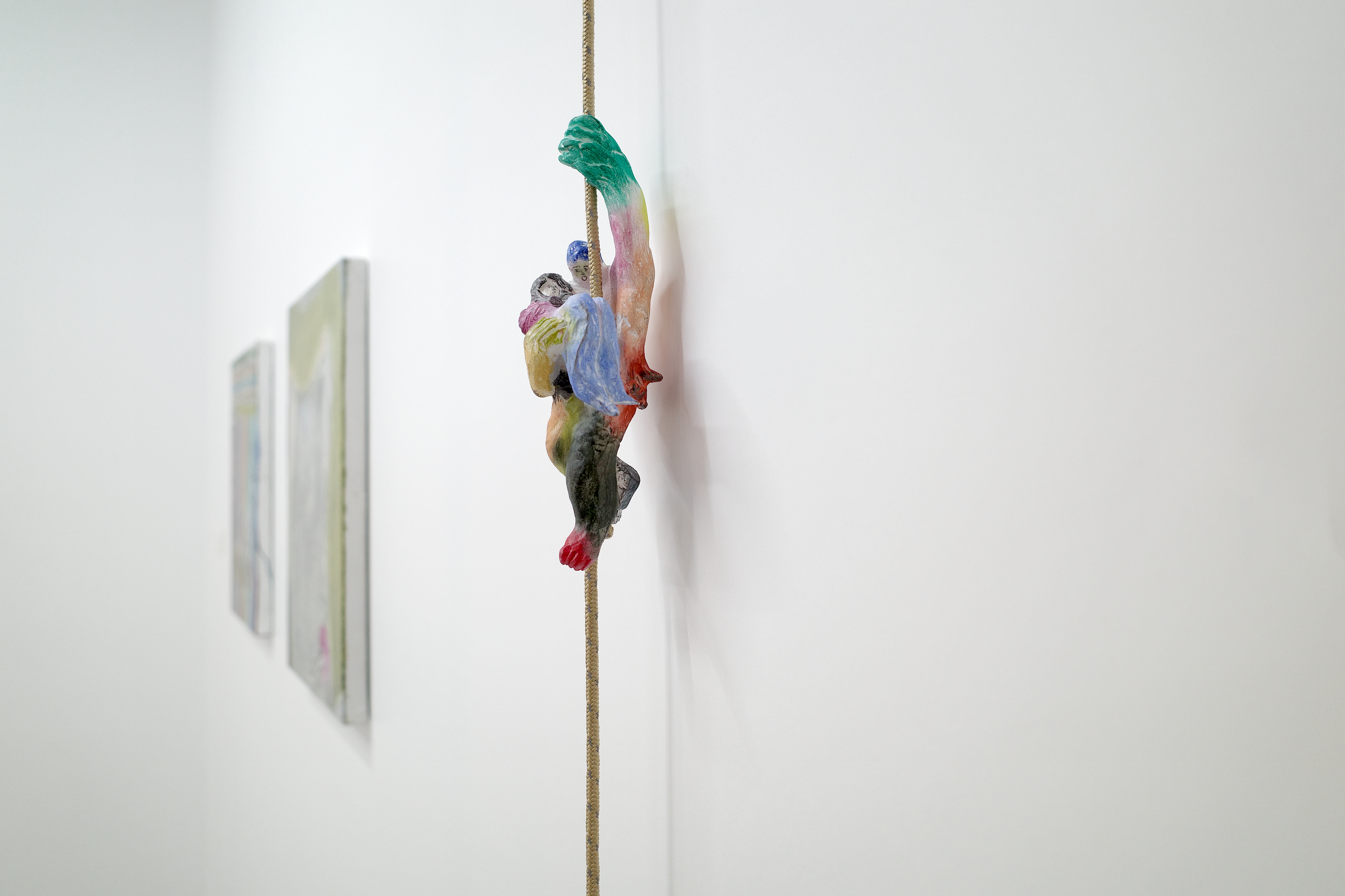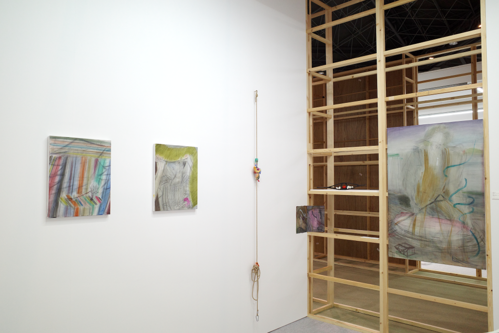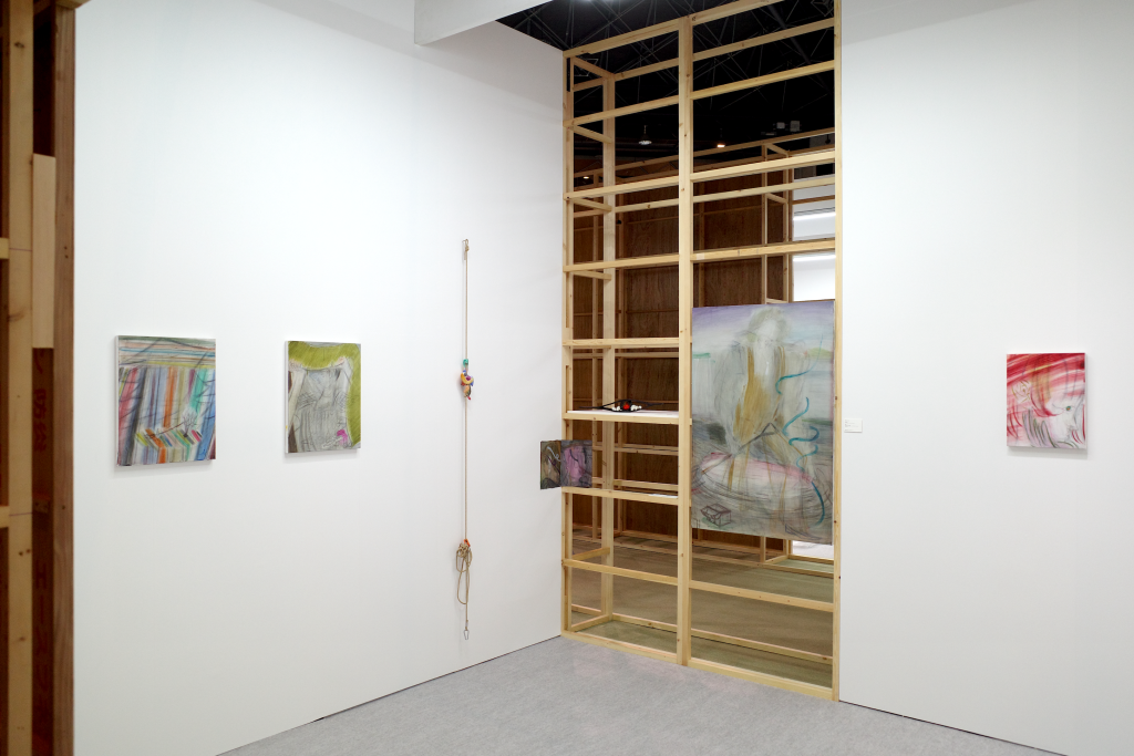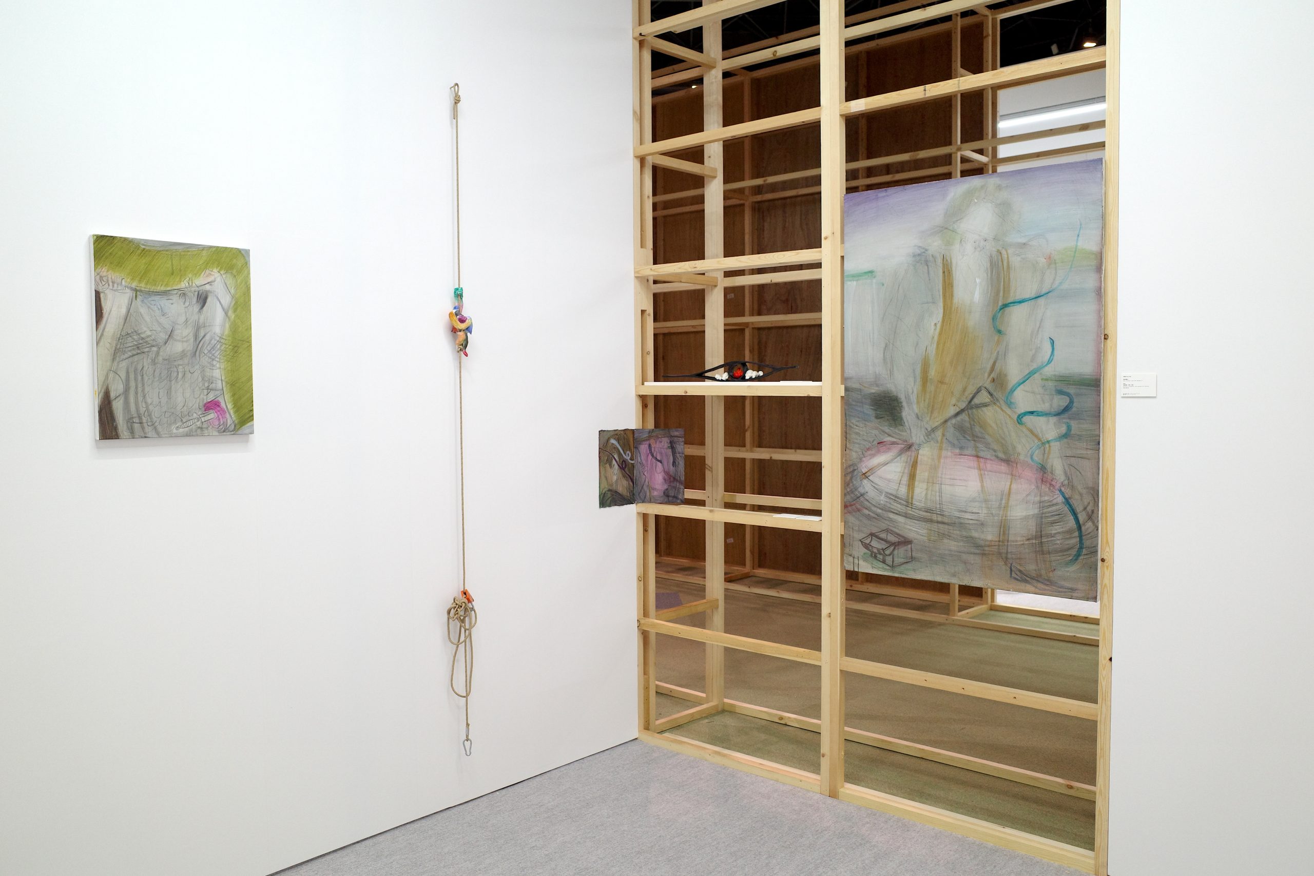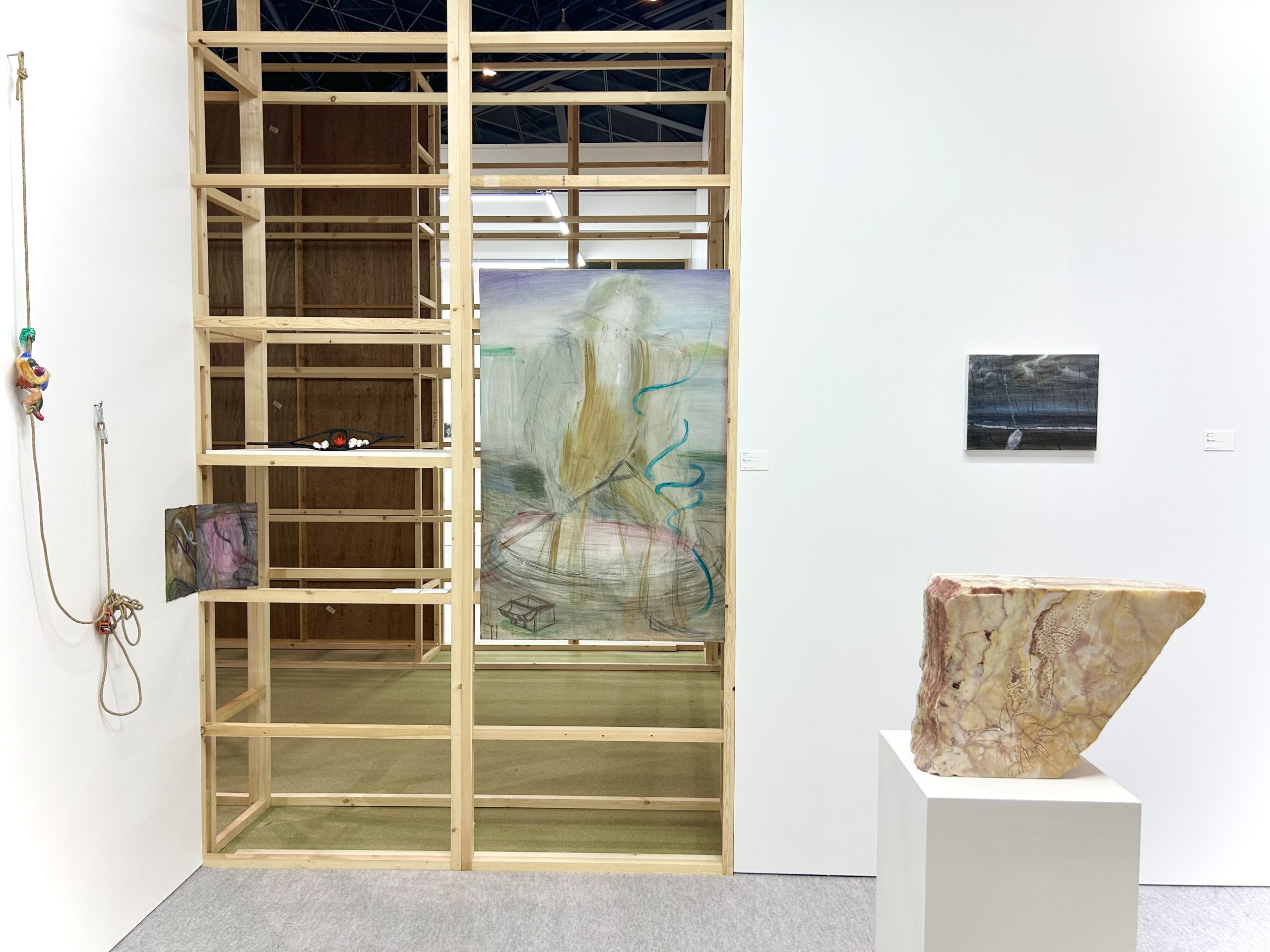 侯逸杰的绘画作品在动势与克制的线条之间营造出张力的空间,融合东方武侠、西方奇幻及动漫元素,构建出传统与当代并置的视觉场域。土取郁香以“双人亲密接触”这一绘画史中常见的图示为线索,探讨绘画媒介的虚构性,揭示爱与暴力、拥抱与支配等对立状态或情境的交织。川内理香子则从身体与自然的关系出发,通过对身体的他者性与神圣感的反思,呈现出自身的身体感受,并由此延伸出对身体与思维、自我与他者等二元对立关系的思考。侯逸杰的泥塑和川内理香子的石雕作品也进一步扩展了“线条”作为表达媒介与材料之间的关系。