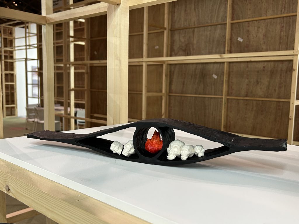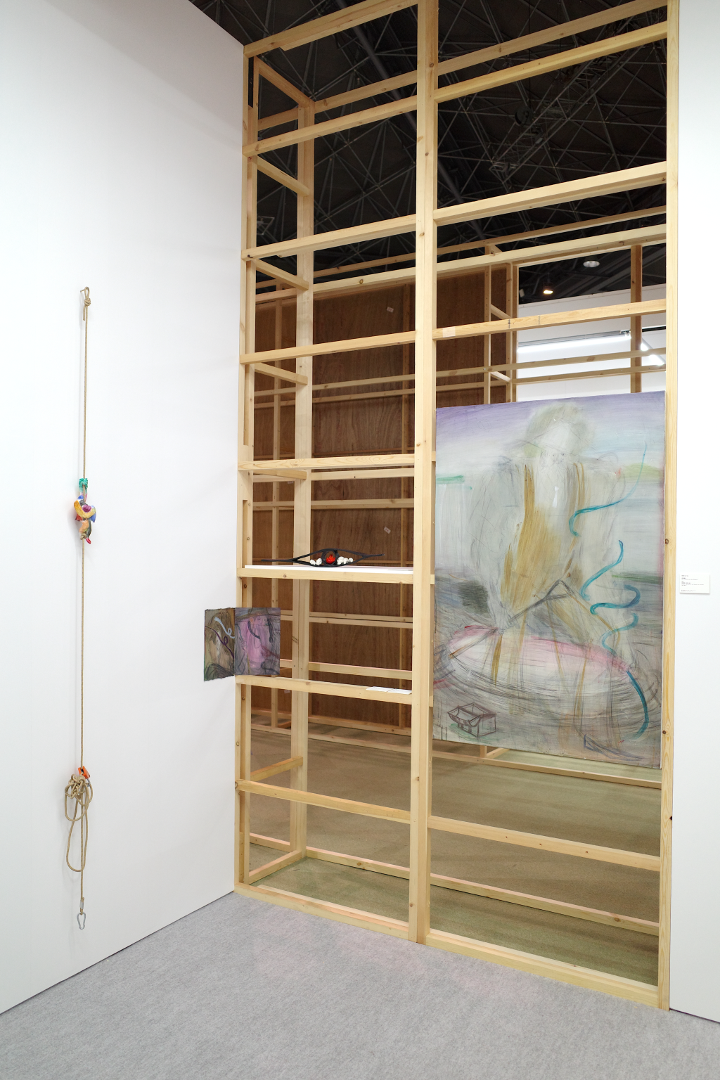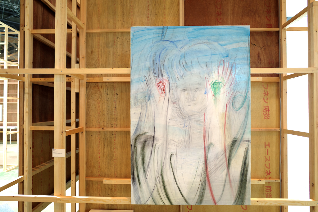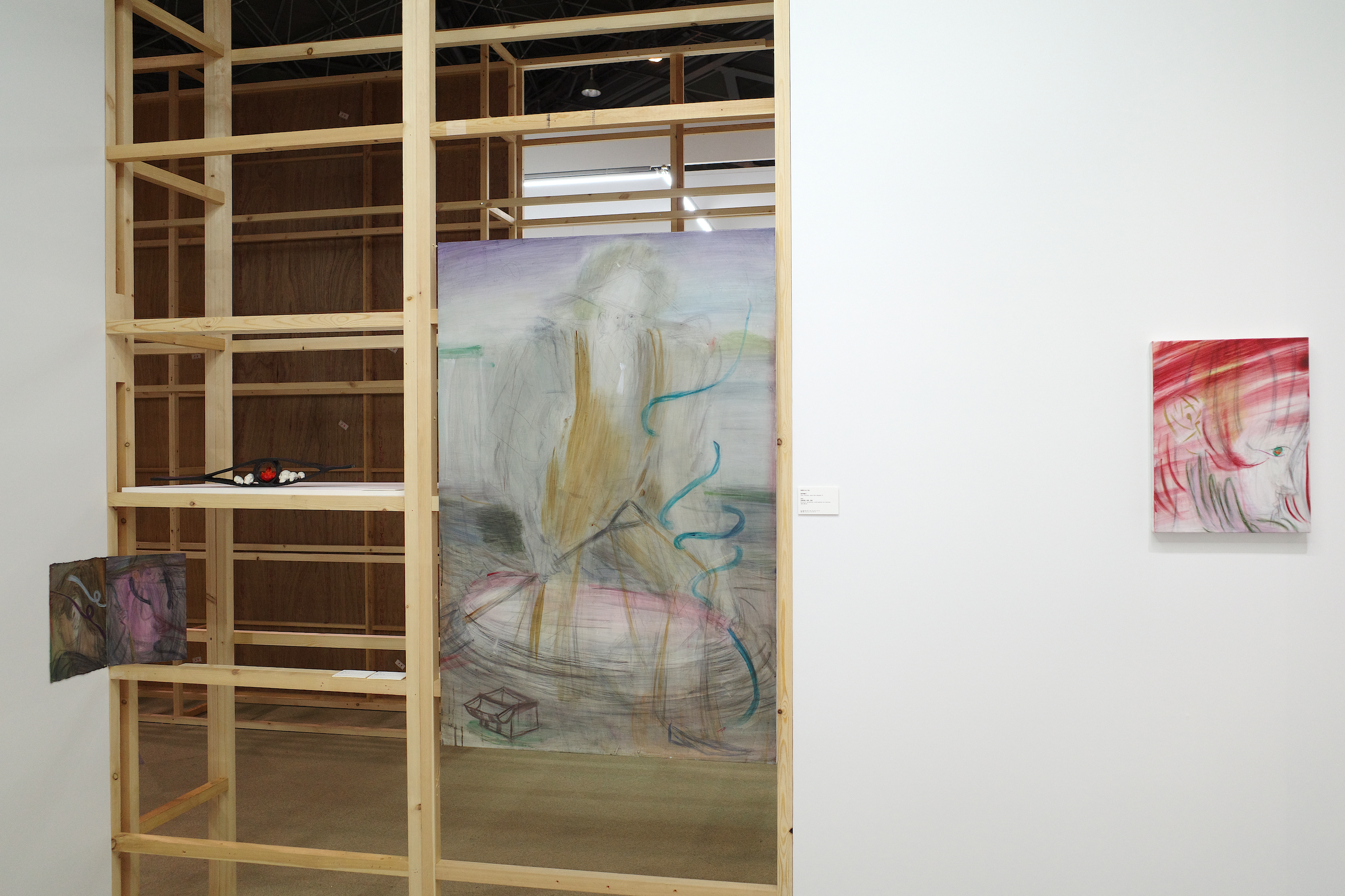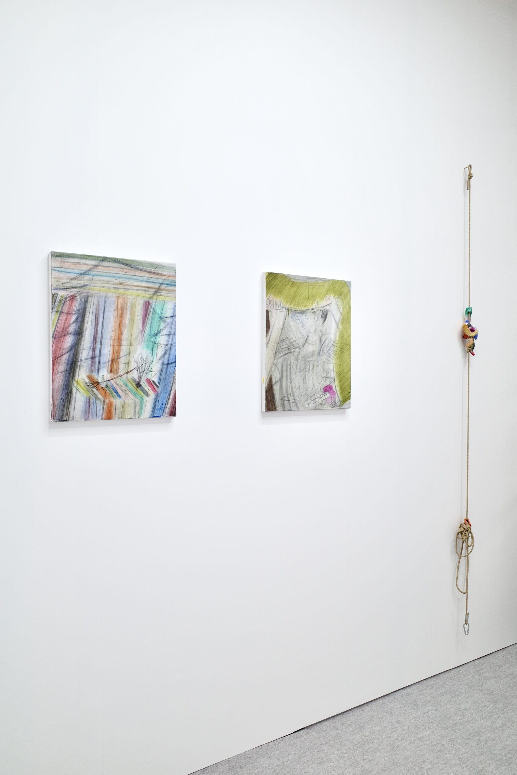 侯逸杰的绘画作品在动势与克制的线条之间营造出张力的空间,融合东方武侠、西方奇幻及动漫元素,构建出传统与当代并置的视觉场域。土取郁香以“双人亲密接触”这一绘画史中常见的图示为线索,探讨绘画媒介的虚构性,揭示爱与暴力、拥抱与支配等对立状态或情境的交织。川内理香子则从身体与自然的关系出发,通过对身体的他者性与神圣感的反思,呈现出自身的身体感受,并由此延伸出对身体与思维、自我与他者等二元对立关系的思考。侯逸杰的泥塑和川内理香子的石雕作品也进一步扩展了“线条”作为表达媒介与材料之间的关系。